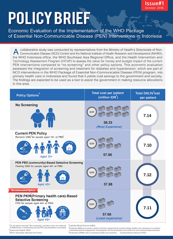 A collaborative study was conducted by representatives from the Ministry of Health’s Directorate of Non – Communicable Disease (NCD) Control and the National Institute of Health Research and Development (NIHRD), the WHO Indonesia office, the WHO Southeast Asia Regional Office, and the Health Intervention and Technology Assessment Program (HITAP) to assess the value for money and budget impact of the current PEN interventions compared to “no screening” and other policy options. This economic evaluation assessed the integration of screening and treatment for diabetes and hypertension, which are part of NCD interventions in the WHO Package of Essential Non-Communicable Disease (PEN) program, into primary health care in Indonesia and found that it yields cost savings to the government and society. The findings are expected to be used as a tool to assist the government in making resource allocations in this area.
