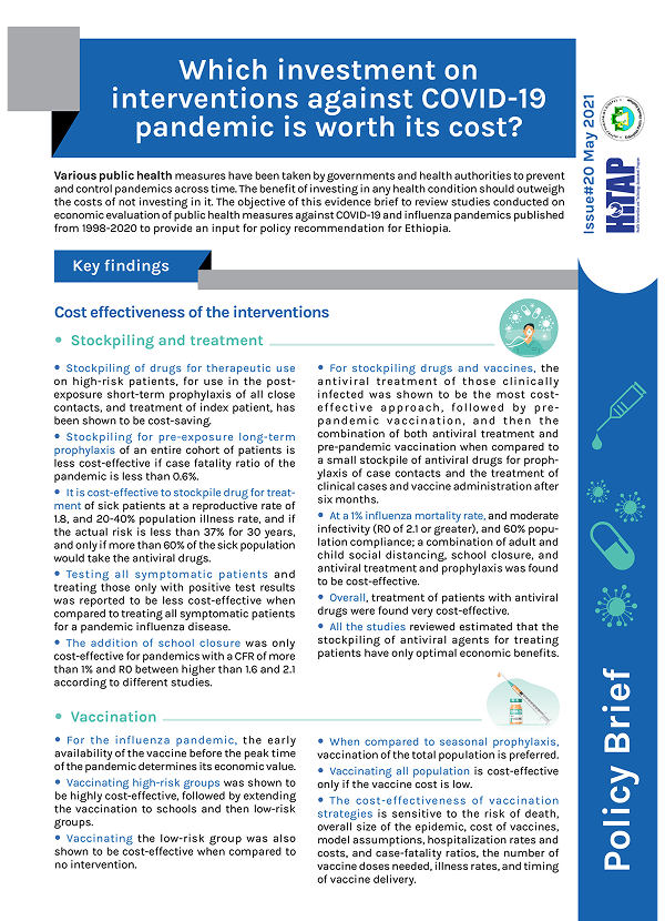 Various public health measures have been taken by governments and health authorities to prevent and control pandemics across time. The benefit of investing in any health condition should outweigh the costs of not investing in it. The objective of this evidence brief to review studies conducted on economic evaluation of public health measures against COVID-19 and influenza pandemics published from 1998-2020 to provide an input for policy recommendation for Ethiopia.