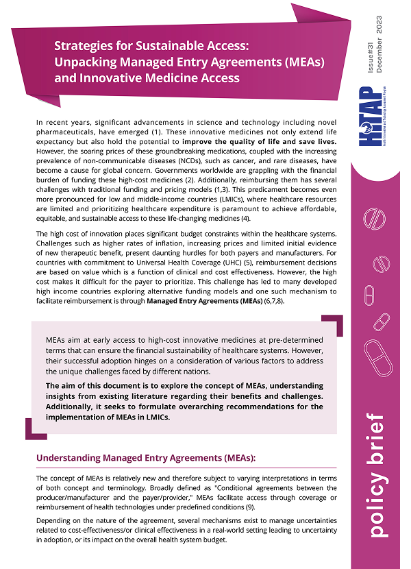 MEAs aim at early access to high-cost innovative medicines at pre-determined terms that can ensure the financial sustainability of healthcare systems. However, their successful adoption hinges on a consideration of various factors to address the unique challenges faced by different nations.