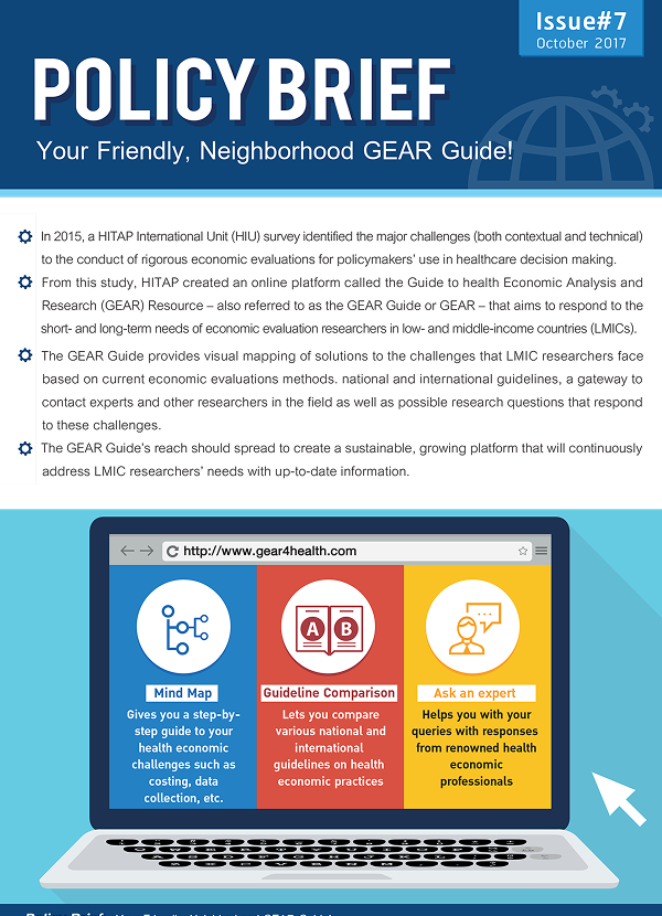 • From this study, HITAP created an online platform called the Guide to health Economic Analysis and Research (GEAR) Resource – also referred to as the GEAR Guide or GEAR – that aims to respond to the short- and long-term needs of economic evaluation researchers in low- and middle-income countries (LMICs).