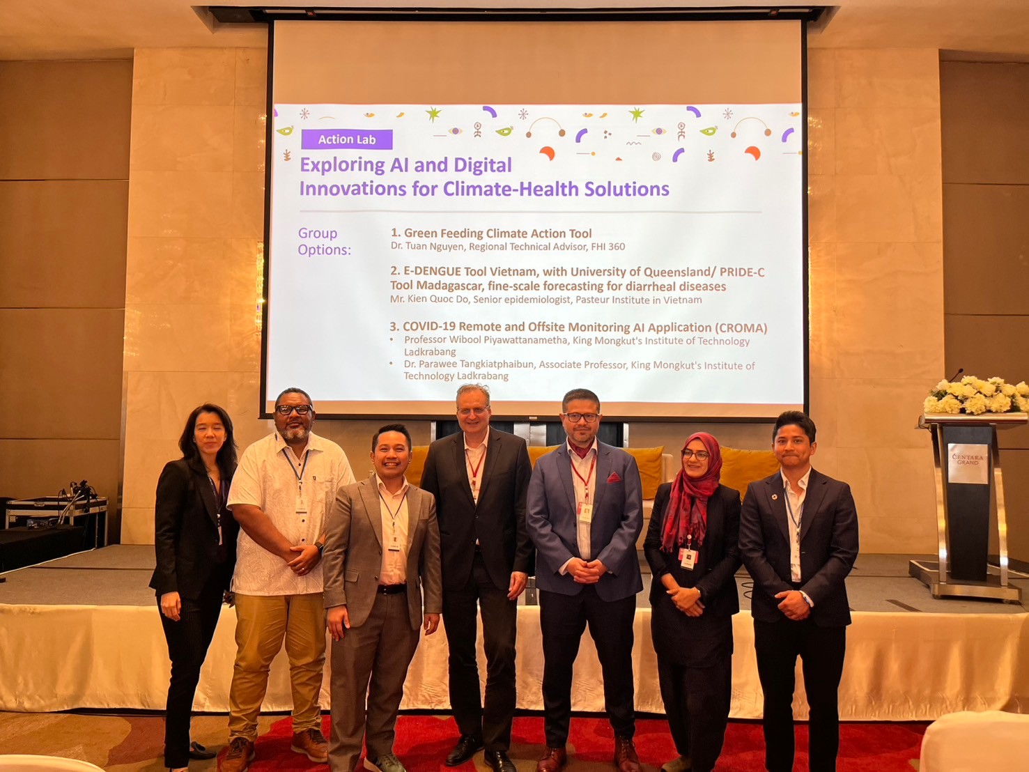 In addition to hosting the side meeting, Sarin KC, Head of the Environmental Economics Unit at HITAP Foundation, was invited to speak at the session titled “Digital Frontiers: Harnessing AI and Digital Technologies to Bridge Climate Action and Health Equity.” In his talk, Sarin shared key insights on the barriers to AI adoption in low- and middle-income countries (LMICs). He highlighted challenges such as fragmented data systems, lack of standardized datasets, health inequalities, the digital divide, funding constraints, and the complexities of cross-disciplinary collaboration. Sarin emphasized the urgent need for cross-sector cooperation and integrated infrastructure to maximize AI’s impact on healthcare and climate initiatives. Sarin stated.