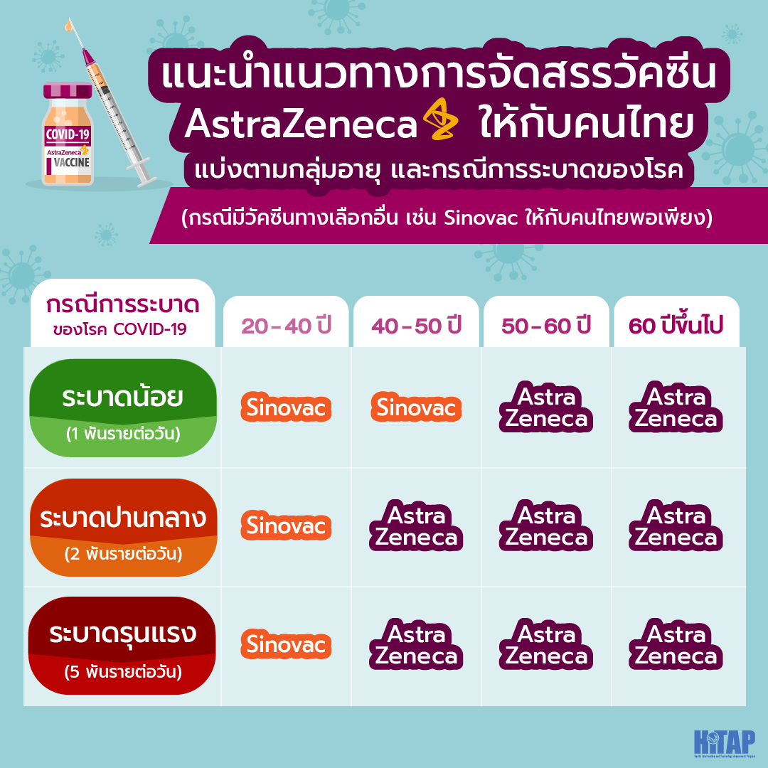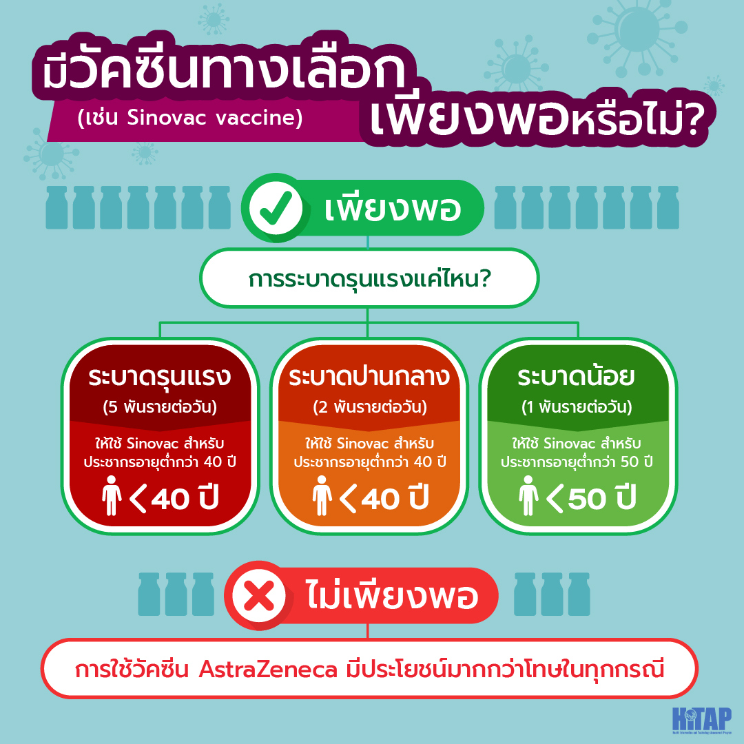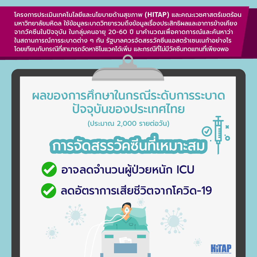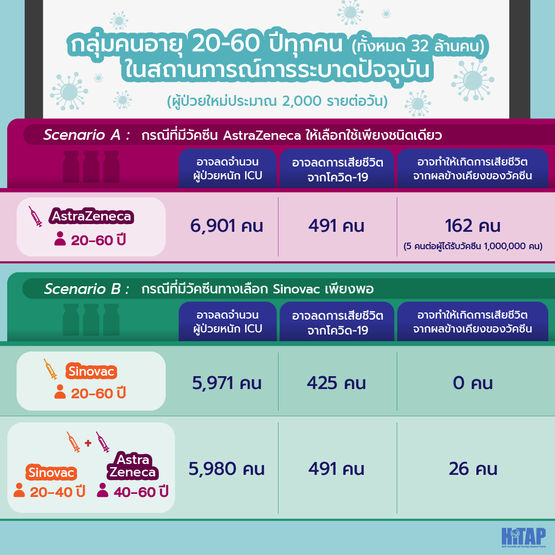 โครงการประเมินเทคโนโลยีและนโยบายด้านสุขภาพ (HITAP) และคณะเวชศาสตร์เขตร้อน มหาวิทยาลัยมหิดล ใช้ข้อมูลระบาดวิทยารวมถึงข้อมูลเรื่องประสิทธิผลและอาการข้างเคียงจากวัคซีนในปัจจุบัน ในกลุ่มคนอายุ 20-60 ปี มาคำนวณเพื่อคาดการณ์และค้นหาว่าในสถานการณ์การระบาดต่าง ๆ กัน รัฐบาลควรจัดสรรวัคซีนแอสตร้าเซนเนก้าอย่างไร โดยเทียบกับกรณีที่สามารถจัดหาซิโนแวคได้เพิ่ม และกรณีที่ไม่มีวัคซีนทดแทนที่เพียงพอ