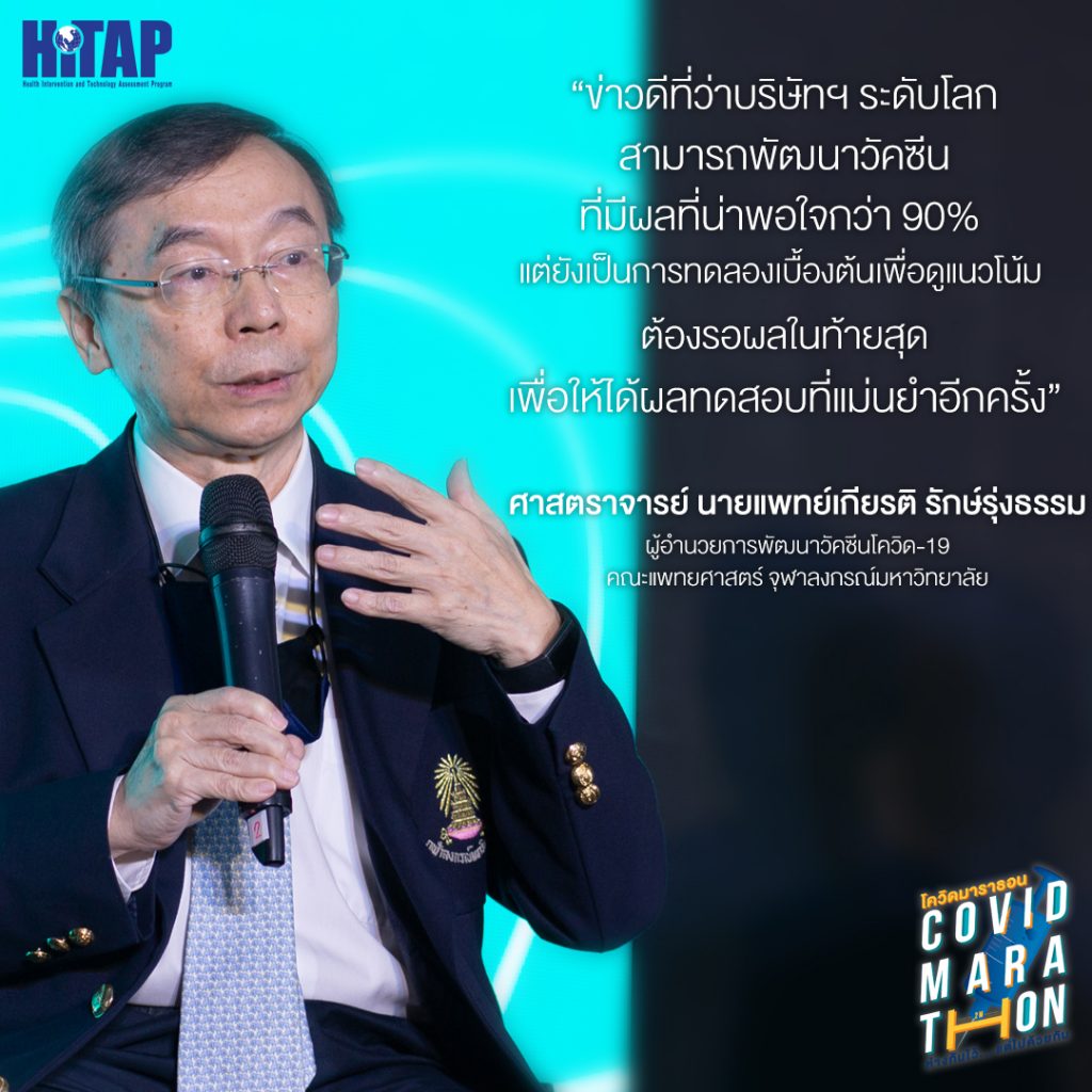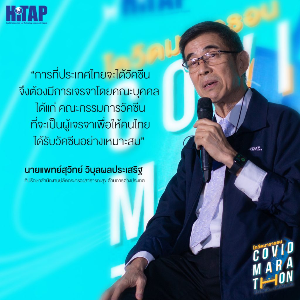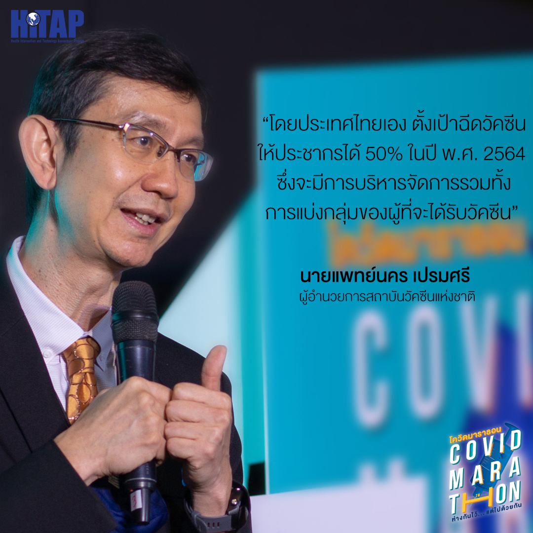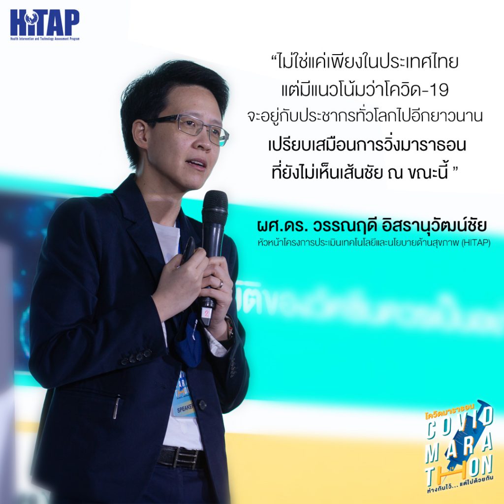 HITAP จึงได้จัดงานทอล์ก COVID marathon ห่างกันไว้ แต่ไปด้วยกัน” โดยวิทยากรผู้เชี่ยวชาญเกี่ยวกับโควิด-19 เพื่อเร่งสร้างความเข้าใจให้กับสังคม การรับมือกับโควิด-19 เหมือนการวิ่งมาราธอนที่ทุกคนต้องใช้ชีวิตปกติไปพร้อมกับความระมัดระวังเพื่อไปให้ถึงเส้นชัยในท้ายที่สุด และต่อไปนี้คือชุดข้อมูลเพื่อให้ทุกคนสามารถวิ่งเข้าเส้นชัยไปด้วยกัน
