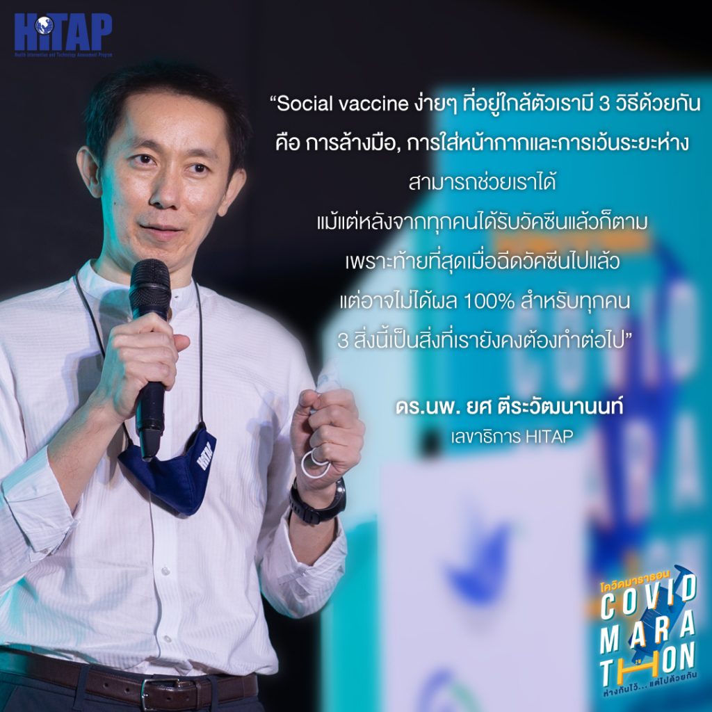 มาถึงตอนนี้ดูเหมือนวัคซีนโควิด-19 จะยังคงไม่ใช่คำตอบของปัญหา การใช้ชีวิตต่อไปอย่างไรท่ามกลางปัญหาต่างหากคือสิ่งสำคัญ ดร.นพ. ยศ ตีระวัฒนานนท์ เลขาธิการ HITAP นำเสนอ Social vaccine หรือวัคซีนทางสังคมซึ่งเป็นวัคซีนที่เราต่างมีกันอยู่แล้ว