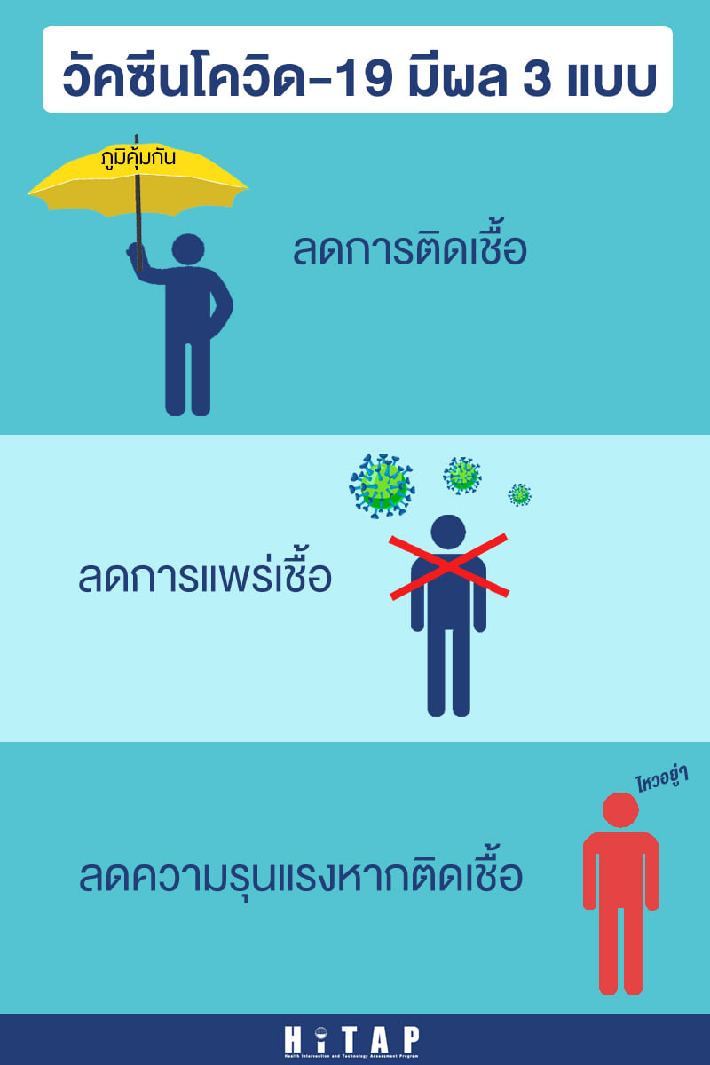 องค์การอนามัยโลกจำแนกผลของวัคซีนเป็น 3 แบบได้แก่ 1. ป้องกันการติดเชื้อ 2. ลดการแพร่เชื้อและ 3. ช่วยลดความรุนแรงหากเป็นโรค