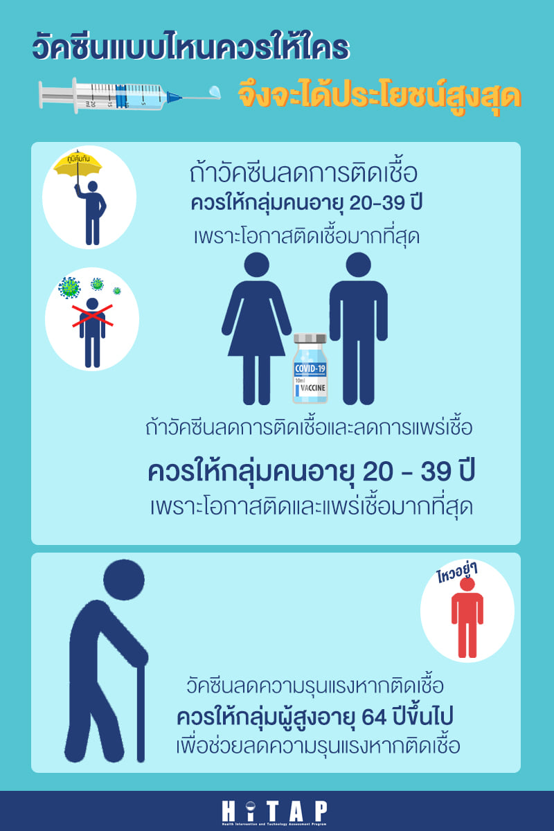 2.2 หากผลของวัคซีนช่วยลดการติดเชื้อและแพร่เชื้อ พบว่ากลุ่มที่ควรได้รับวัคซีนก่อนคือ “กลุ่มคนอายุ 20 – 39 ปี” เช่นกันเพราะมีโอกาสติดเชื้อมากที่สุด