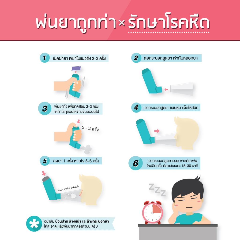 พ่นยาถูกวิธี ชีวิตเปลี่ยน ยารักษาโรคหืดมีทั้งยากิน ยาฉีด ยาสูดพ่น ซึ่งยาสูดพ่นที่เรียกว่า inhaled corticosteroids หรือ ICS นั้นเป็นชนิดที่มีประสิทธิภาพและปลอดภัยที่สุด ยาสูดพ่นเป็นยาที่เดินทางตามการสูดจากปากเข้าสู่หลอดลมออกฤทธิ์โดยตรงต่อปอด จึงใช้ปริมาณยาที่น้อยเมื่อเทียบกับยากิน แต่ในผู้ป่วยใหม่ที่ได้รับยาสูดอาจไม่มีประสบการณ์ ซึ่งควรฝึกฝนให้เกิดความคุ้นเคย จะทำให้สูดยาได้อย่างถูกต้อง การสูดยา ICS อย่างถูกต้องจะทำให้เกิดการซ่านเข้าสู่หลอดลมที่มีการอักเสบโดยตรง ซึ่งระยะพ่นยาที่ถูกต้องมีความสำคัญอย่างมาก (ควรสูดพ่นที่ระยะ 1 ฟุต) เนื่องจากจะทำให้ผู้ป่วยได้รับขนาดละอองยาที่เหมาะสมและซึมเข้าสู่เนื้อเยื่อปอดช่วงหลอดลมส่วนปลายได้ดีและได้รับปริมาณยาที่เพียงพอต่อการรักษา การพ่นผ่านกระบอกสูดยาทำให้มีระยะเหมาะสมและทำให้ยาส่วนหนึ่งตกค้างที่กระบอก ไม่เข้าสู่ร่างกายมากเกินไป เมื่อพ่นเสร็จให้บ้วนน้ำกลั้วคอเพื่อล้างตัวยาที่ตกค้างในช่องปากทิ้งทันทีและเช็ดปากให้สะอาด จะยิ่งลดผลข้างเคียงที่จะเข้าสู่กระแสเลือดได้