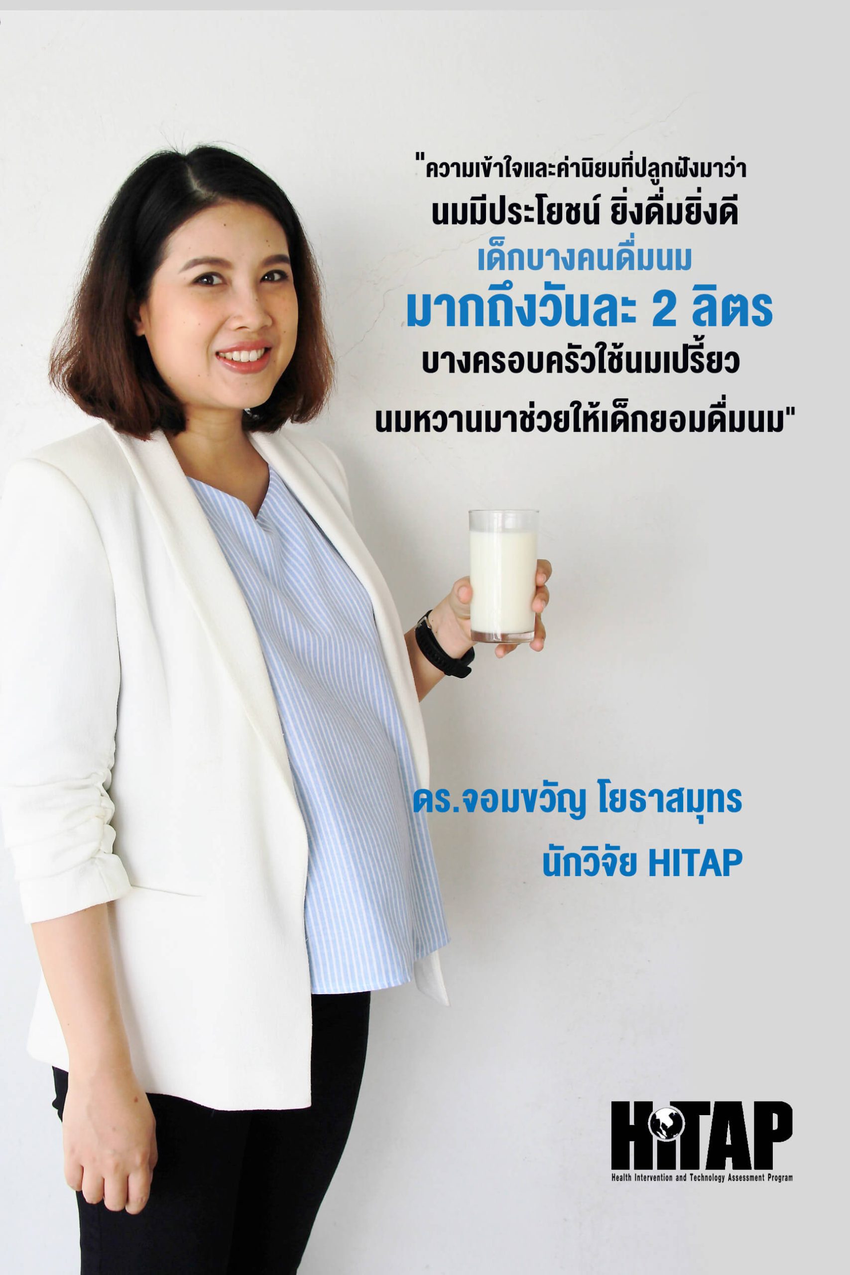 “วันนี้คุณดื่มนมแล้วหรือยัง” ประโยคที่หลายคนคุ้นเคยจากการรณรงค์การดื่มนมเมื่อ 20 กว่าปีที่ผ่านมา นมเป็นอาหาร 1 ใน 5 หมู่ในหมวดโปรตีนที่อาจจะได้รับการโฆษณาและรณรงค์มากที่สุดก็ว่าได้ ทุกครั้งที่ดื่มนมหรือเลือกนมให้บุตร ไม่ว่าจะเป็นนมพร้อมดื่มหรือนมผง เรารู้สึกว่ากำลังมอบสิ่งดี ๆ ให้กับตนเองและคนที่เรารัก แต่นมก็เหมือนกับอาหารทุกชนิดที่ต้องทานอย่างพอดี HITAP ขอพาท่านไปพบแง่มุมอื่น ๆ ของนมเพื่อให้การบริโภคนมของเราเกิดประโยชน์สูงสุดและไม่ตกเป็นเหยื่อการตลาดรวมถึงความเข้าใจผิดที่มีต่อ “นม” อาหารที่มีประโยชน์มากมายชนิดนี้ โดยข้อมูลที่นำมาเสนอส่วนหนึ่งมาจากงานวิจัยของนักวิจัย HITAP เพื่อให้ผู้บริโภคอย่างเราได้ตั้งคำถามและใช้ข้อมูลประกอบการเลือกซื้อและบริโภคนม
