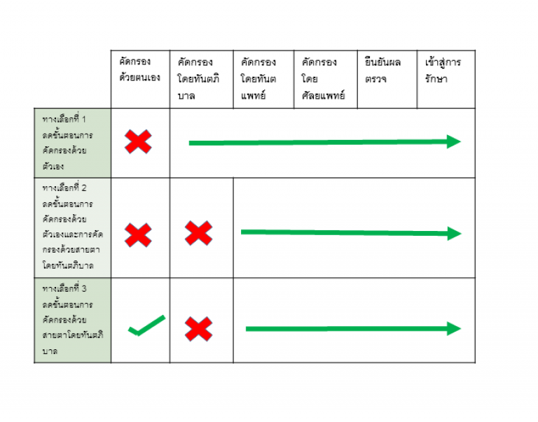 - ปรับปรุงขั้นตอนของโปรแกรมการคัดกรองฯ โดยลดขั้นตอนใดขั้นตอนหนึ่งลง จะทำให้เกิดความคุ้มค่าทางเศรษฐศาสตร์ของรูปแบบโปรแกรมการคัดกรองมะเร็งมากขึ้น โดยมี 3 ทางเลือกดังต่อไปนี้