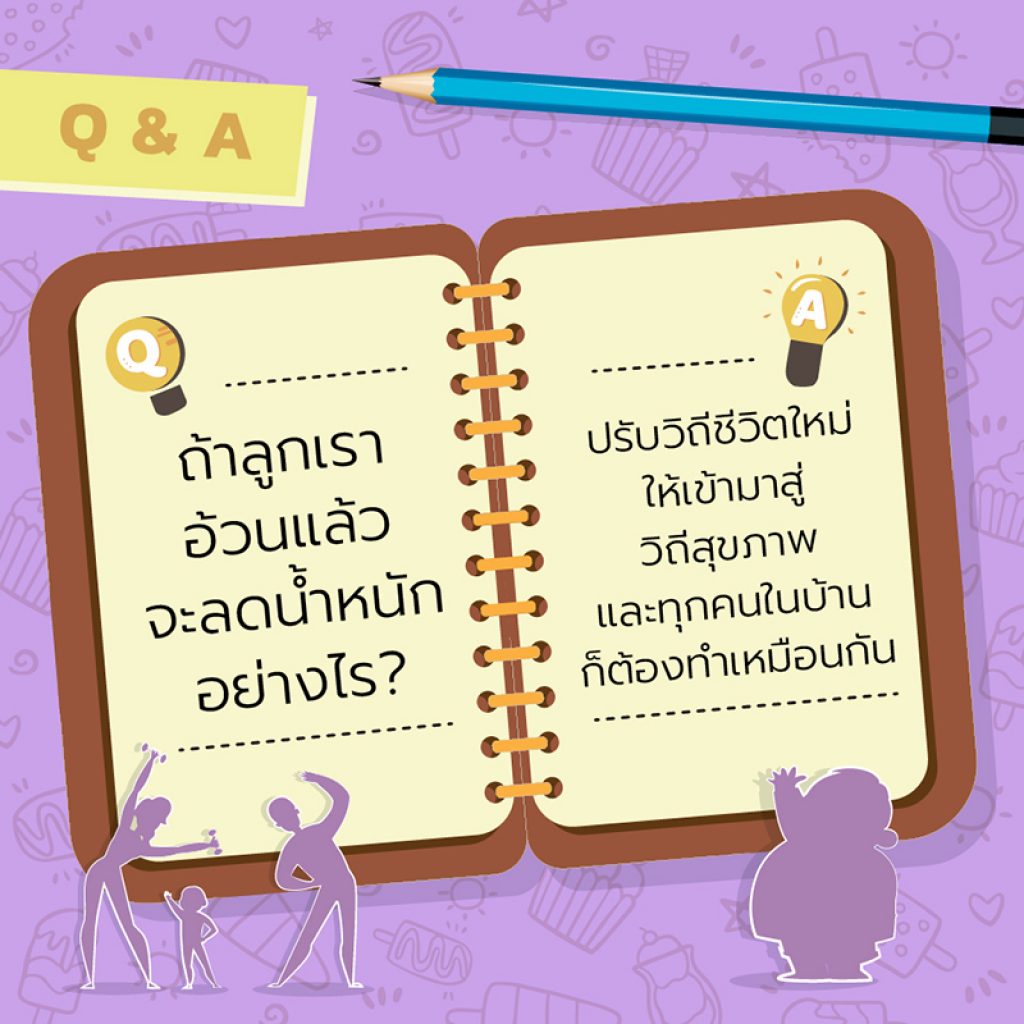 ถ้าอ้วนแล้วอยากจะลด ก็ต้องมาปรับวิถีชีวิตใหม่ ให้เข้ามาสู่วิถีสุขภาพ อาหารก็ต้องค่อยๆ ปรับ จะเปลี่ยนทันทีก็ไม่ได้ ต้องค่อยๆ ลด และทุกคนในบ้านก็ต้องทำเหมือนกัน ไม่ใช่ว่ามีเมนูพิเศษเฉพาะเด็กอ้วน”