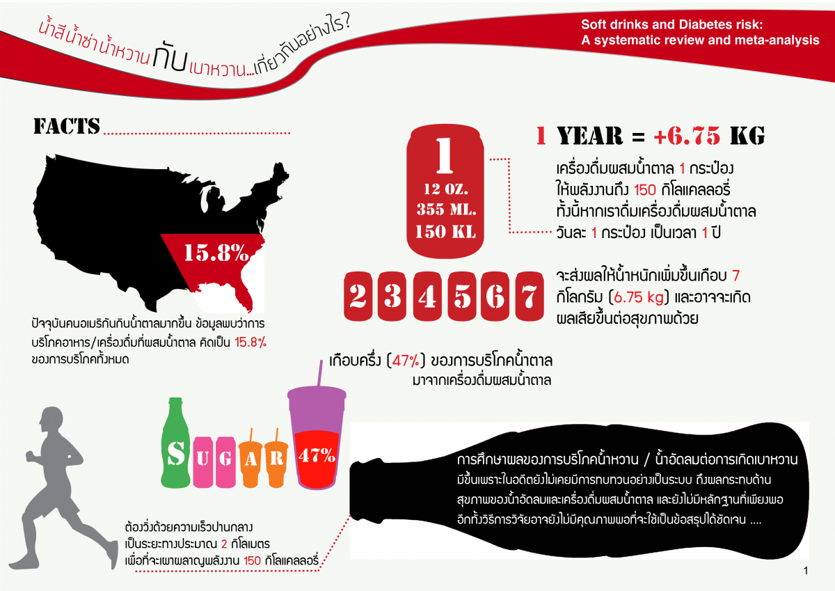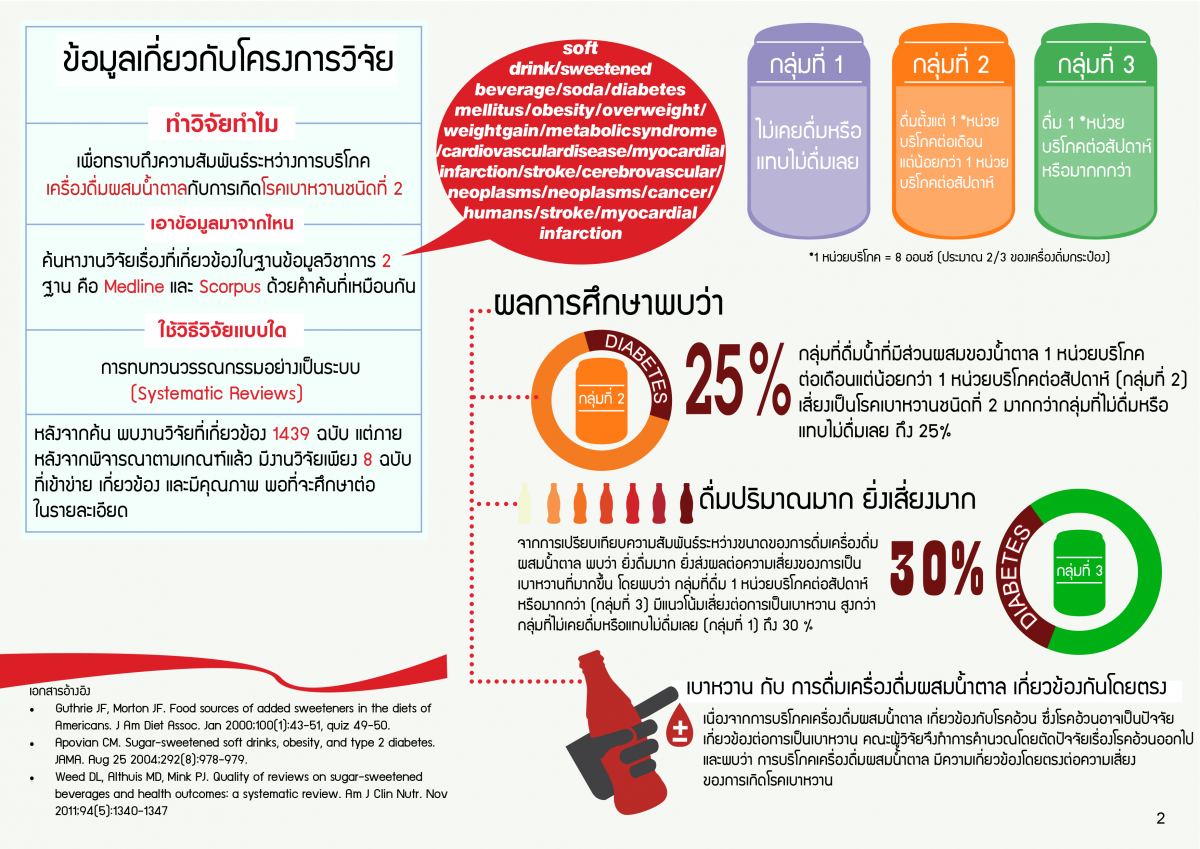 ใครเคยสงสัยบ้างว่า การบริโภคเครื่องดื่มที่มีน้ำตาล มีควาสัมพันธ์กับแนวโน้มการเป็นเบาหวานหรือไม่ ? นักวิจัย HITAP จึงไปศึกษาด้วยการทบทวนวรรณกรรม หรืองานวิจัยที่เคยทำมาแล้วหาข้อสรุปต่อคำถามดังกล่าว รายละเอียดตาม Infographic ค่ะ
