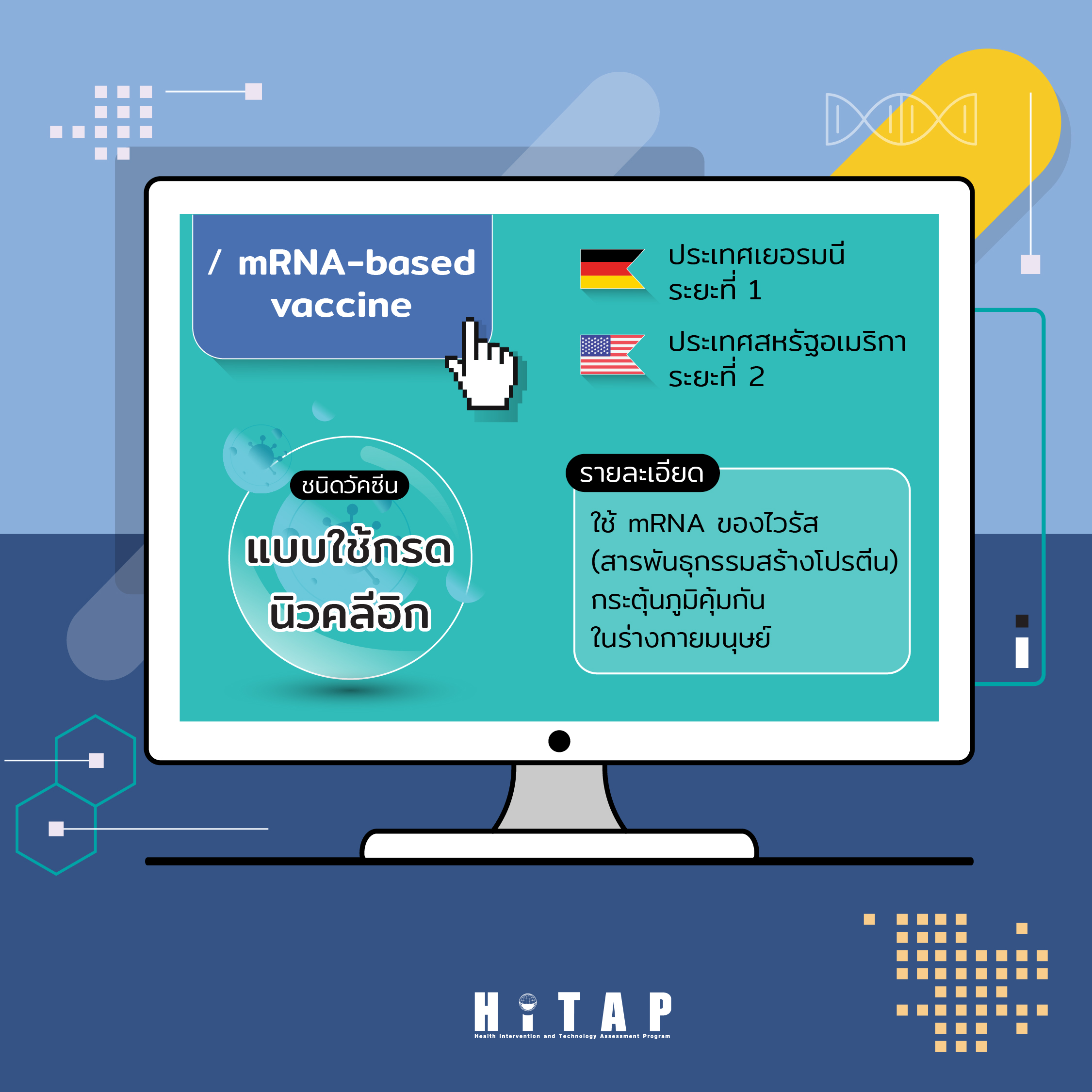 ต่อมาที่ประเทศเยอรมนี บริษัทเอกชนชั้นนำด้านการผลิตวัคซีนได้พัฒนาวัคซีนต้านโควิด-19 จาก mRNA ของเชื้อไวรัส (mRNA คือ โมเลกุลของสารพันธุกรรม RNA ซึ่งเป็นเสมือนแม่พิมพ์สำหรับสร้างโปรตีนของไวรัส) เพื่อใช้กระตุ้นร่างกายให้สร้างภูมิคุ้มกันจากโควิด-19 โดยวัคซีนนี้กำลังอยู่ในการทดลองระยะที่ 1[ii] สหรัฐอเมริกาก็มีการทดลองวัคซีนที่พัฒนาจาก mRNA เช่นกัน ตั้งชื่อวัคซีนว่า mRNA-1273 โดยที่อยู่ในระยะที่ 2 ของการทดลอง