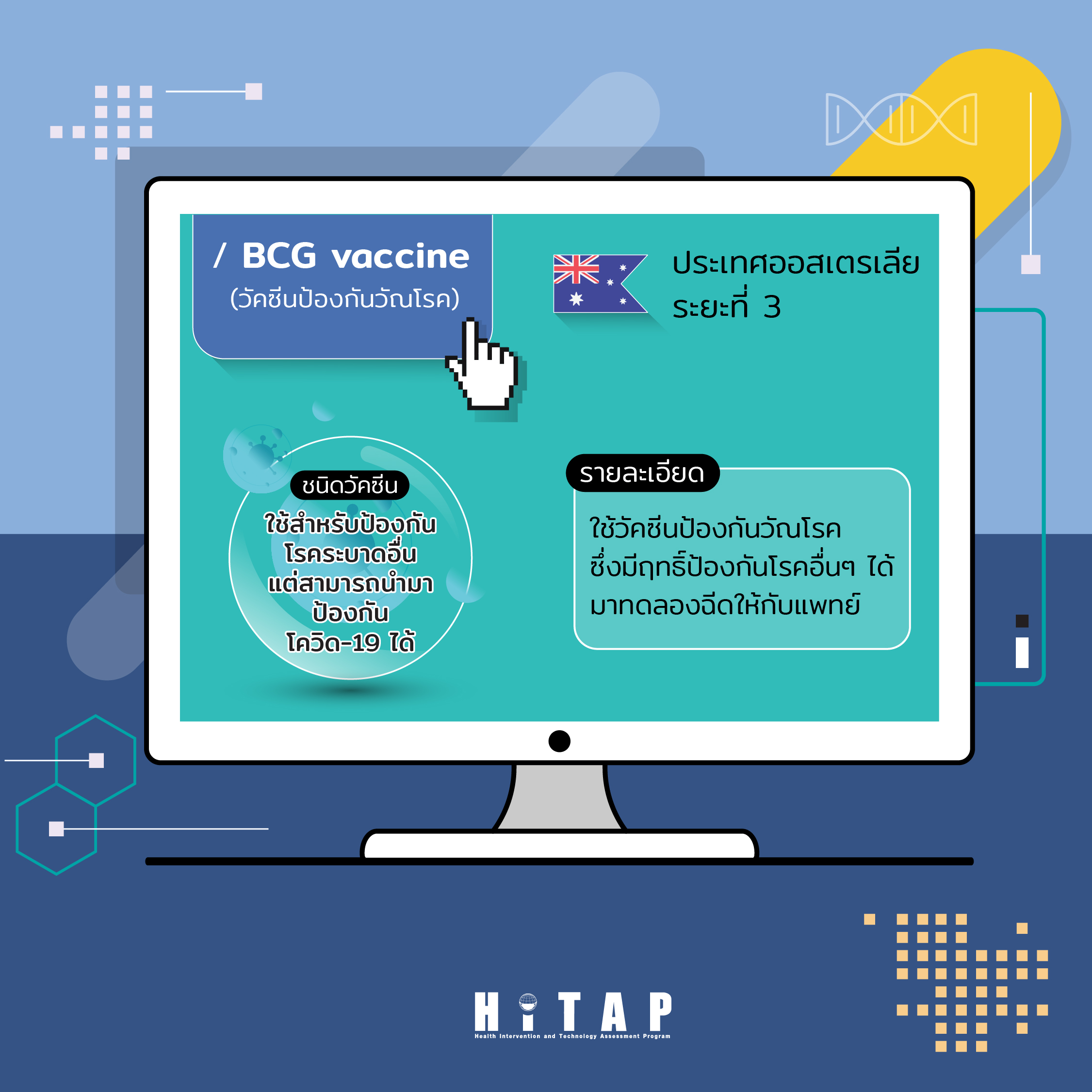 ที่ประเทศออสเตรเลีย สถาบันวิจัย Murdoch Children’s Research Institute ได้ทำการวิจัยร่วมกับมหาวิทยาลัย The University of Melbourne ในการนำวัคซีนป้องกันวัณโรค ซึ่งมีฤทธิ์กระตุ้นภูมิคุ้มกันของโรคอื่น ๆ อีกมากมายด้วย มาทดลองฉีดให้กับแพทย์ที่ต้องคลุกคลีกับผู้ป่วยจำนวนมาก เพื่อทดสอบว่าวัคซีนชนิดนี้สามารถป้องกันการติดเชื้อโควิด-19 ได้มากน้อยแค่ไหน โดยการทดลองนี้อยู่ในระยะที่ 3 หรือระยะการทดลองกับอาสาสมัครจำนวนมากที่มีความหลากหลายทั้งในด้านเพศ อายุ และปัจจัยอื่น ๆ[iii]
