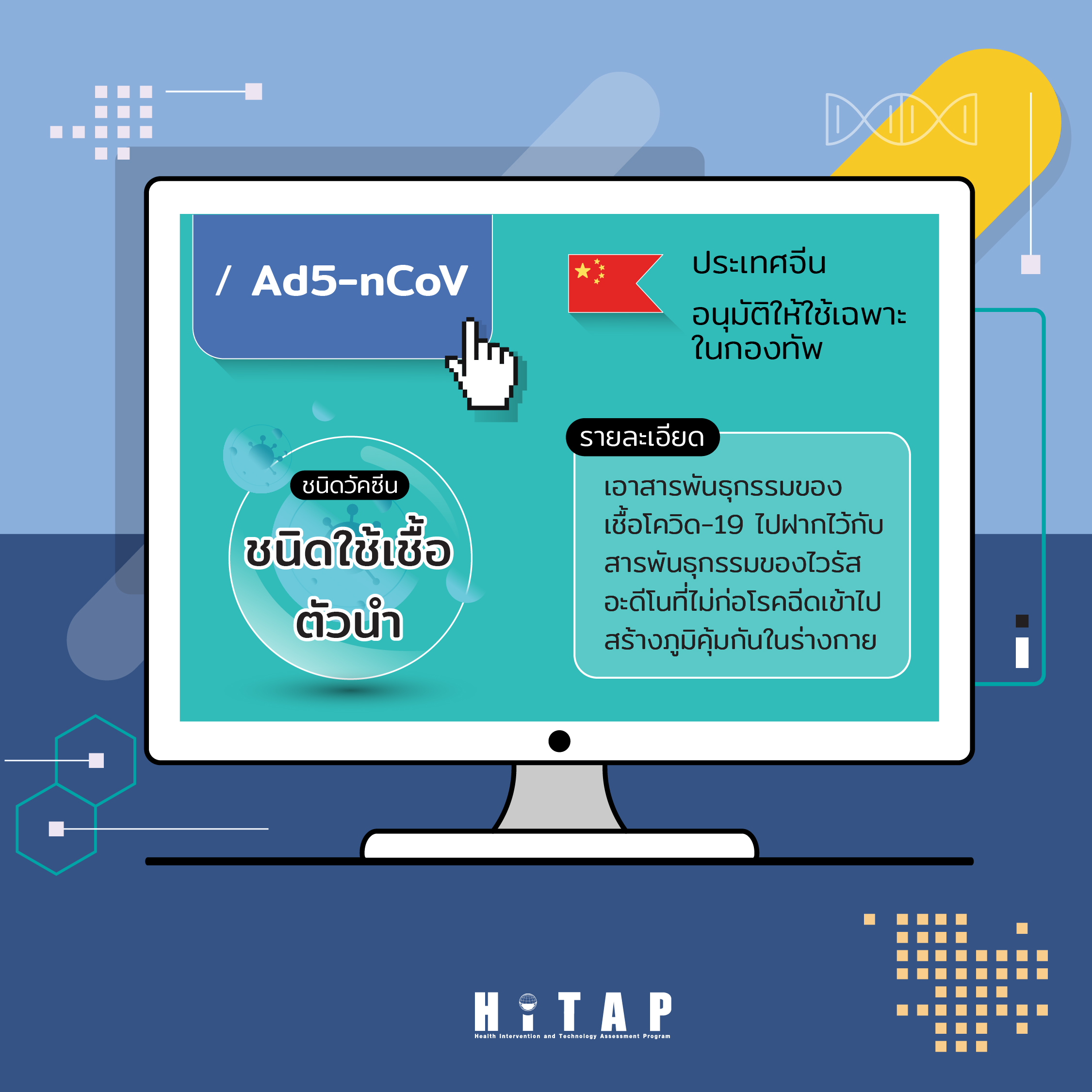 สุดท้าย ประเทศจีนได้คิดค้นวัคซีนชนิดใช้เชื้อตัวนำ (viral-vector vaccine) ชื่อว่า Ad5-nCoV โดยนำเอาสารพันธุกรรมของเชื้อโควิด-19 ไปฝากไว้กับสารพันธุกรรมของไวรัสอะดีโน (adenovirus: Ad5) ที่ไม่สามารถก่อให้เกิดโรคได้แล้ว ฉีดเข้าไปในร่างกายเพื่อสร้างภูมิคุ้มกันแทนการใช้เชื้อโควิด-19 โดยตรง วัคซีนชนิดนี้ได้รับการรับรองให้นำไปใช้ได้แล้วโดยคณะกรรมาธิการการทหารส่วนกลางของจีน แต่จำกัดการใช้งานไว้เพียงในกองทัพเท่านั้นเป็นระยะเวลา 1 ปี[iv]