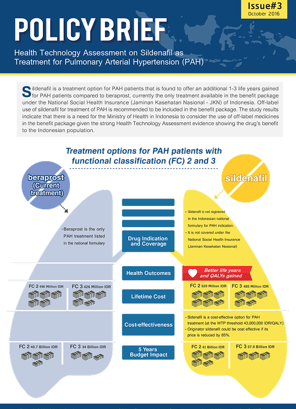Sildenafil is a treatment option for PAH patients that is found to offer an additional 1-3 life years gained for PAH patients compared to beraprost, currently the only treatment available in the benefit package under the National Social Health Insurance (Jaminan Kasehatan Nasional – JKN) of Indonesia. Off-label use of sildenafil for treatment of PAH is recommended to be included in the benefit package. The study results indicate that there is a need for the Ministry of Health in Indonesia to consider the use of off-label medicines in the benefit package given the strong Health Technology Assessment evidence showing the drug’s benefit to the Indonesian population.