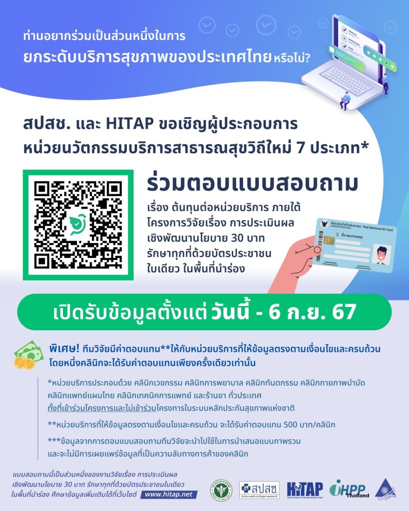 สำนักงานหลักประกันสุขภาพแห่งชาติ (สปสช.) และ โครงการประเมินเทคโนโลยีและนโยบายด้านสุขภาพ (HITAP) ขอเชิญผู้ประกอบการหน่วยนวัตกรรมบริการสาธารณสุขวิถีใหม่ 7 ประเภท ประกอบด้วย คลินิกเวชกรรม, คลินิกการพยาบาล, คลินิกทันตกรรม, คลินิกกายภาพบำบัด, คลินิกแพทย์แผนไทย, คลินิกเทคนิคการแพทย์ และร้านยา ทั่วประเทศ ทั้งที่เข้าร่วมโครงการและไม่เข้าร่วมโครงการในระบบหลักประกันสุขภาพแห่งชาติ ร่วมตอบแบบสอบถามเรื่อง “ต้นทุนต่อหน่วยบริการ ภายใต้โครงการวิจัยเรื่อง การประเมินผลเชิงพัฒนานโยบาย 30 บาท รักษาทุกที่ด้วยบัตรประชาชนใบเดียว ในพื้นที่นําร่อง” โดยข้อมูลที่ได้จากแบบสอบถามนี้ จะนำไปใช้ในการศึกษาต้นทุนต่อหน่วยในการให้บริการ เพื่อหาอัตราการเบิกจ่ายที่เหมาะสมให้กับหน่วยบริการต่อไป