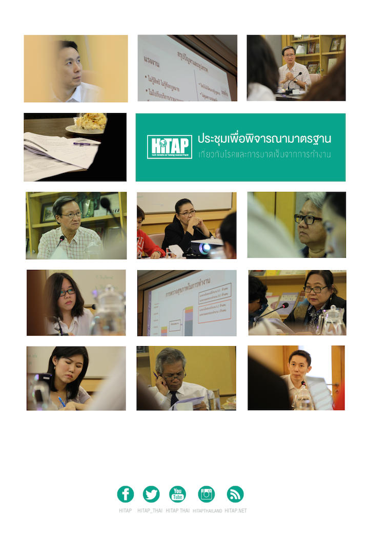 วันที่ 10 มิ.ย. 57 คณะผู้วิจัย HITAP จัดประชุมผู้เชี่ยวชาญด้านอาชีวะอนามัย เพื่อพิจารณาความเป็นไปได้ของมาตรการเกี่ยวกับโรคและการบาดเจ็บจากการทำงานที่เหมาะสมกับบริบทของประเทศไทย ซึ่งเป็นส่วนหนึ่งของโครงการพัฒนาข้อเสนอเพื่อปรับปรุงชุดสิทธิประโยชน์และระบบบริการด้านการสร้างเสริมสุขภาพและป้องกันโรคสำหรับผู้ใหญ่ และวัยทำงาน เพื่อเป็นข้อมูลประกอบการตัดสินใจของ สำนักงานหลักประกันสุขภาพแห่งชาติ (สปสช.)