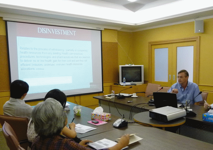 เมื่อวันที่ 15 กันยายน พ.ศ.2553 นักวิจัย HITAP จัด Journal Club ประจำเดือนกันยายน 2553 ณ ห้องประชุมใหญ่ HITAP ชั้น 6 อาคาร 6 กรมอนามัยในหัวข้อ “Health Technology Disinvestment” บรรยายโดย Thierry Defechereux, MD. จาก Johns Hopkins School of Public Health โดยได้รับเกียรติจาก นพ.สุรจิต สุนทรธรรม จากสำนักงานหลักประกันสุขภาพแห่งชาติเข้าร่วมฟังบรรยายในครั้งนี้ เนื้อหาในการประชุมกล่าวถึงกระบวนการเพิกถอนเทคโนโลยีด้านสุขภาพไม่ว่าจะเป็นเครื่องมือแพทย์หรือยาที่ถูกประเมินแล้วว่าหากนำไปใช้จะไม่เกิดความคุ้มค่าต่อระบบบริการทางสุขภาพ