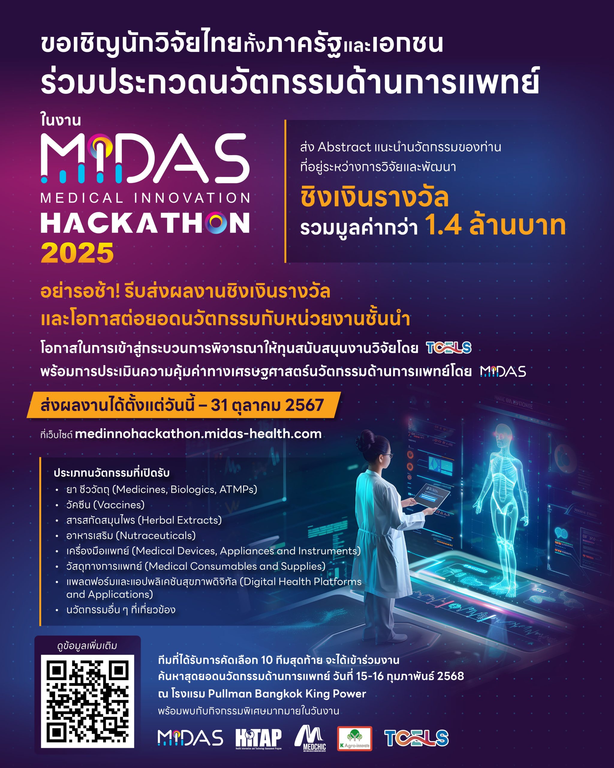 MIDAS ขอเชิญนักวิจัยทั้งภาครัฐและเอกชน เข้าร่วมประกวดนวัตกรรมด้านการแพทย์ในงาน “MIDAS Medical Innovation Hackathon 2025” ชิงเงินรางวัลรวมมูลค่ากว่า 1.4 ล้านบาท