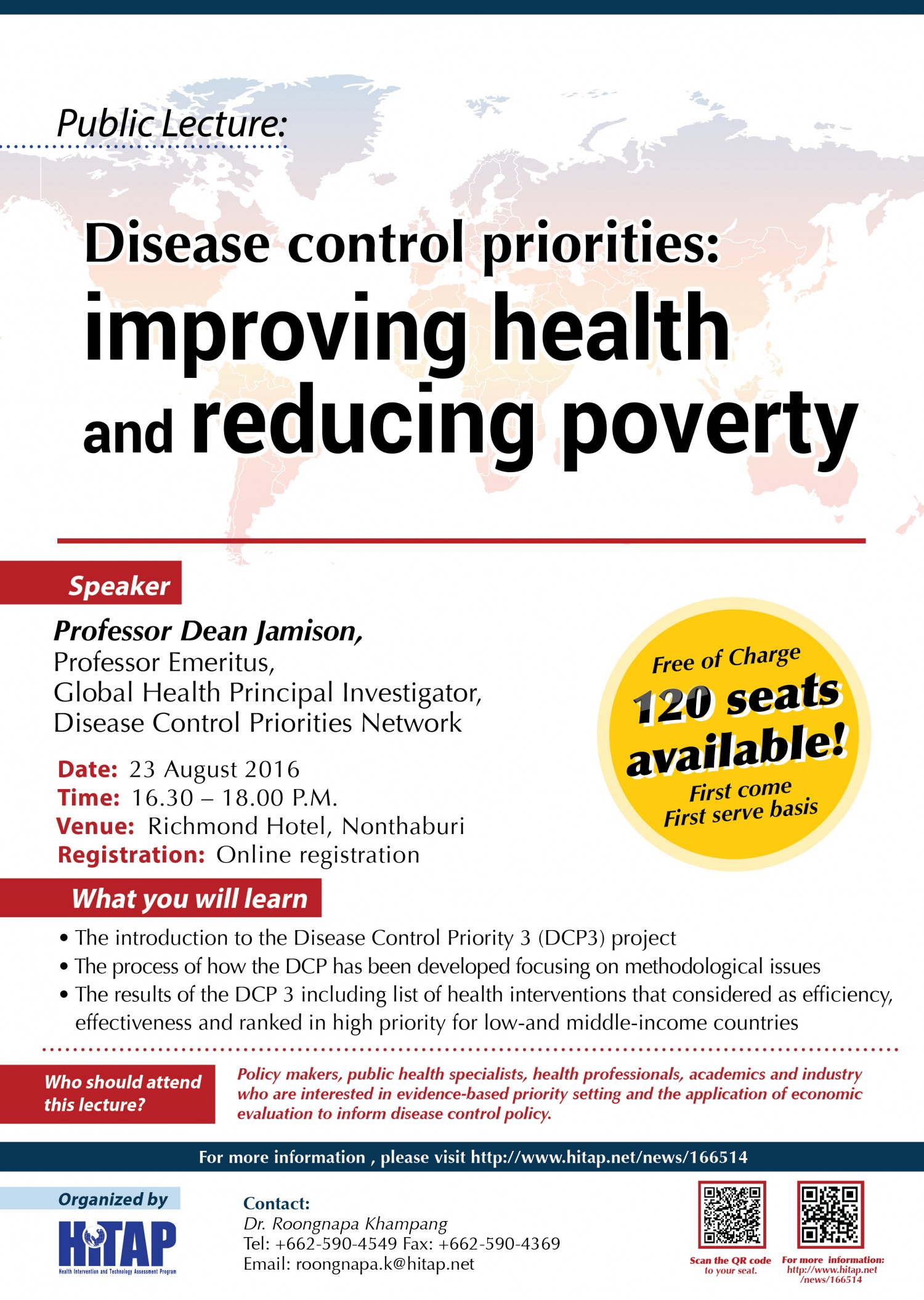 In this lecture, Professor Dean will give a brief introduction to the project, talk you through the process of how the DCP has been developed focusing on methodological issues, as well as presenting results of the DCP 3 including the list of health interventions for infectious and chronic diseases, including conditions related to environmental health, trauma and mental disorders that considered as efficiency, effectiveness and ranked in high priority for LMICs. In addition, the session will be moderated by Dr. Yot Teerawattananon, HITAP program leader.