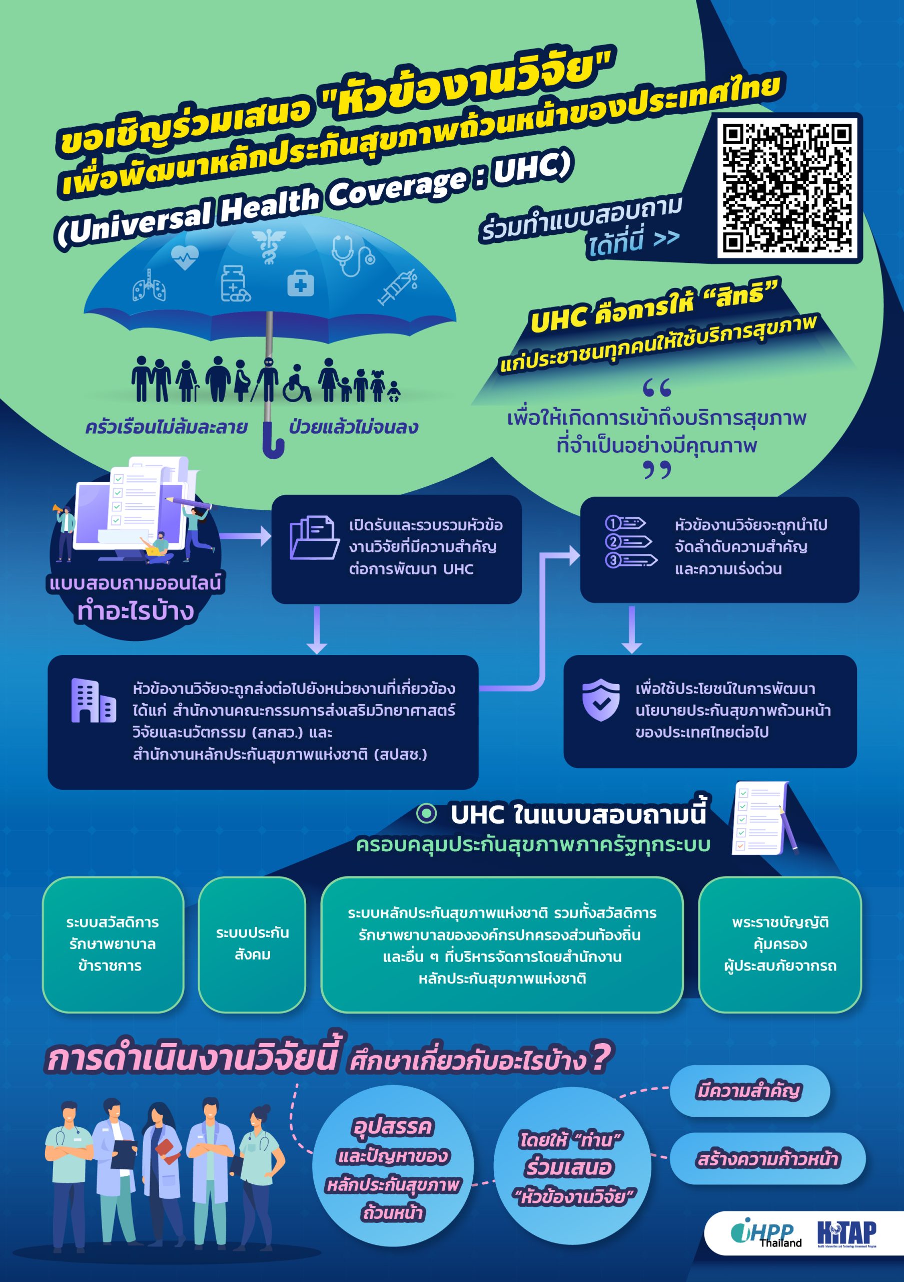 ขอเชิญร่วมเสนอ “หัวข้องานวิจัย” เพื่อพัฒนาหลักประกันสุขภาพถ้วนหน้าของประเทศไทย โดยหัวข้องานวิจัยที่ท่านเสนอจะถูกรวบรวมและจัดลำดับความสำคัญ เพื่อส่งต่อให้หน่วยงานที่เกี่ยวข้อง ได้แก่ สำนักงานคณะกรรมการส่งเสริมวิทยาศาสตร์วิจัยและนวัตกรรม (สกสว.) และสำนักงานหลักประกันสุขภาพแห่งชาติ (สปสช.) สำหรับพิจารณาเพื่อนำไปพัฒนาระบบหลักประกันสุขภาพถ้วนหน้าของประเทศต่อไป