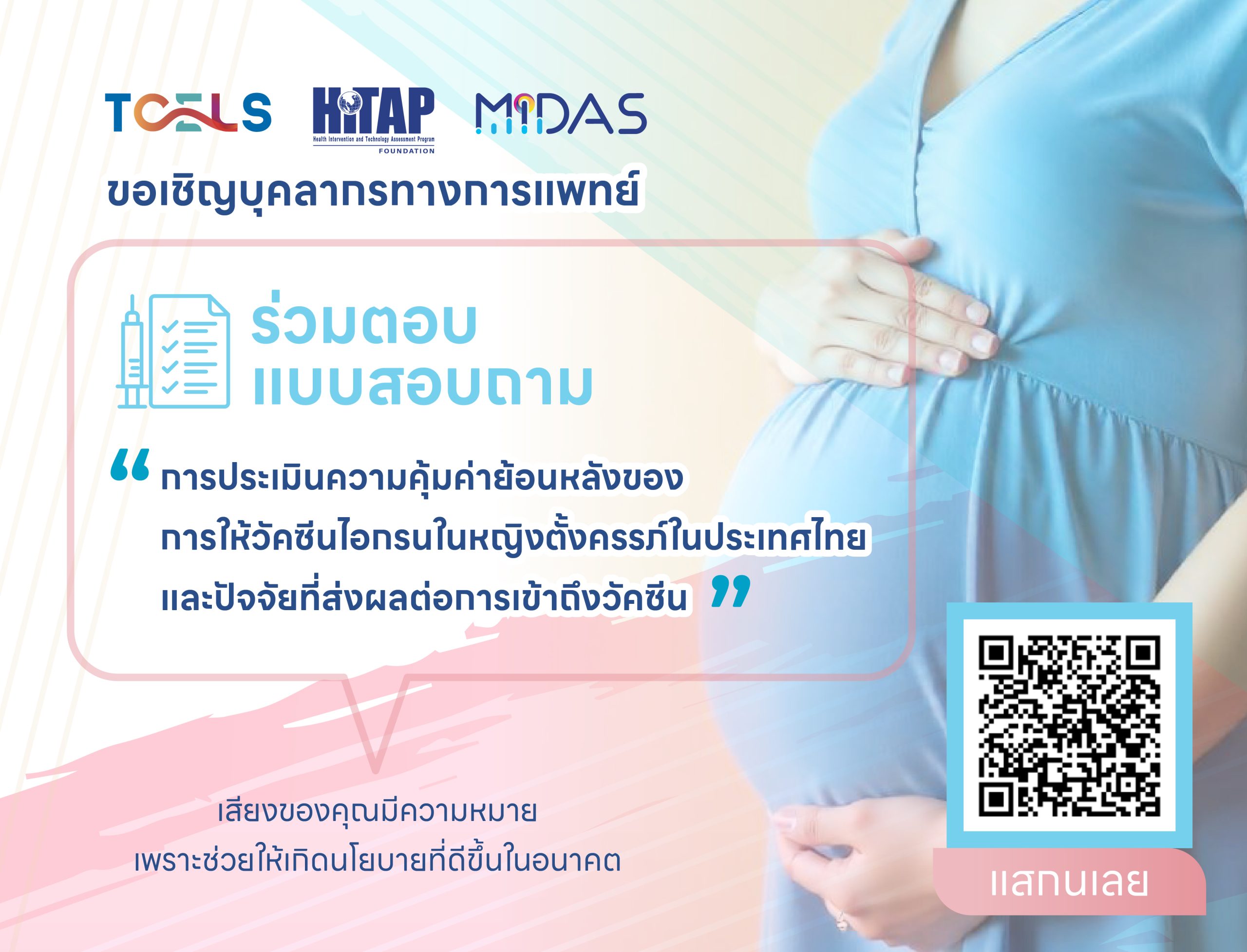 มูลนิธิเพื่อการประเมินเทคโนโลยีและนโยบายด้านสุขภาพ (HITAP) ขอเชิญบุคลากรทางการแพทย์ ร่วมตอบแบบสอบถาม “การประเมินความคุ้มค่าย้อนหลังของการให้วัคซีนไอกรนในหญิงตั้งครรภ์ในประเทศไทย  และปัจจัยที่ส่งผลต่อการเข้าถึงวัคซีน” เพื่อประเมินปัจจัยที่ส่งผลกระทบต่อการนำวัคซีนไอกรนไปใช้จริงในหญิงตั้งครรภ์ ทำแบบสอบถามได้ที่เว็บไซต์ https://sprw.io/stt-gsSZo